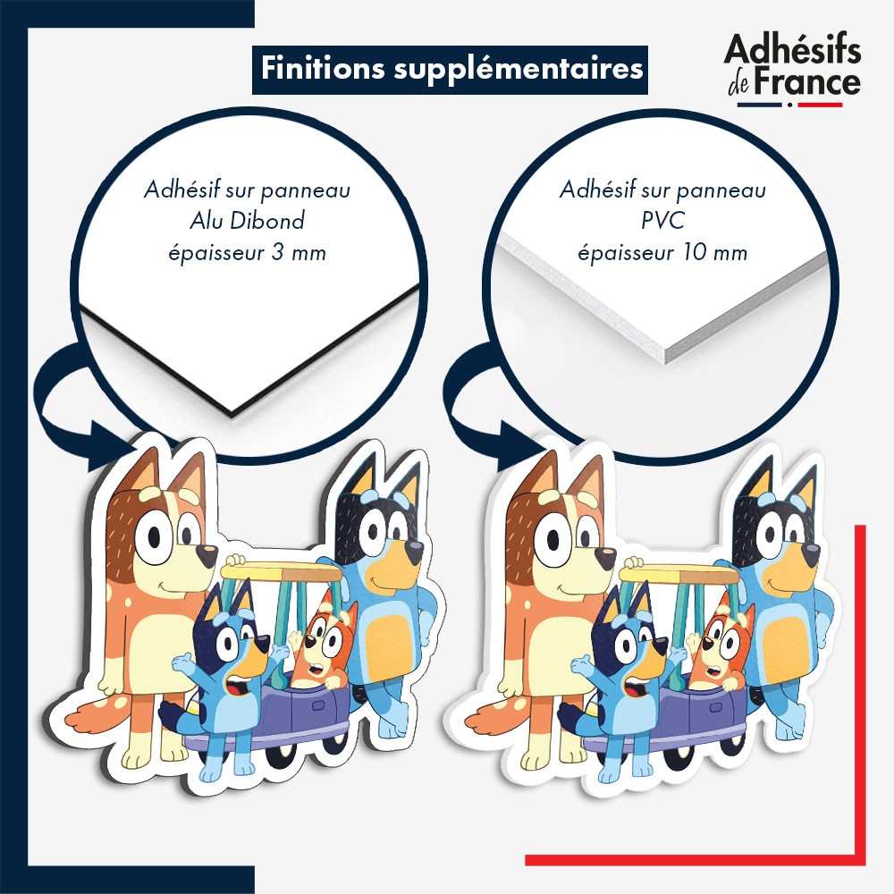 Les autocollants Bluey ou les plaques décoratives rigides en PVC ou aluminium Dibond sont d'excellentes idées de cadeau pour les anniversaires, fêtes ou petites attentions. Les enfants seront ravis de retrouver leurs héros préférés dans une version ludique et colorée.