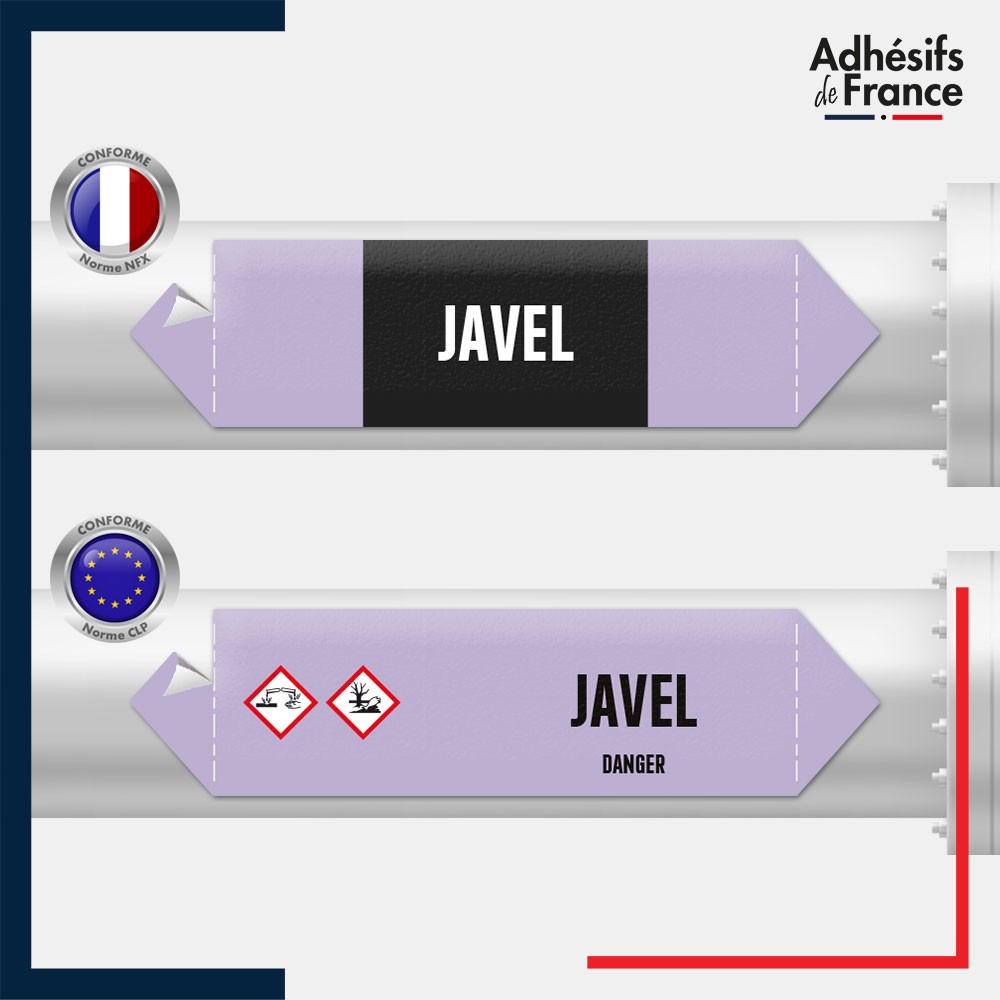 Marqueur adhésif de Tuyauterie - Acide - Javel imprimé sur un adhésif vinyle laminé (plastifié) avec une colle renforcée s'adaptant et résistant à tous types de tuyauteries et d'environnements.