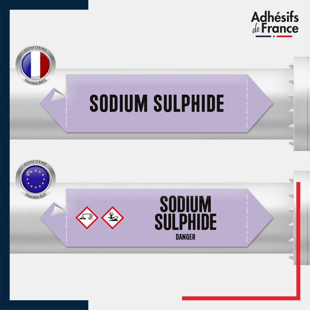 Marqueur adhésif de Tuyauterie - Acide - Sodium sulphide imprimé sur un adhésif vinyle laminé (plastifié) avec une colle renforcée s'adaptant et résistant à tous types de tuyauteries et d'environnements.