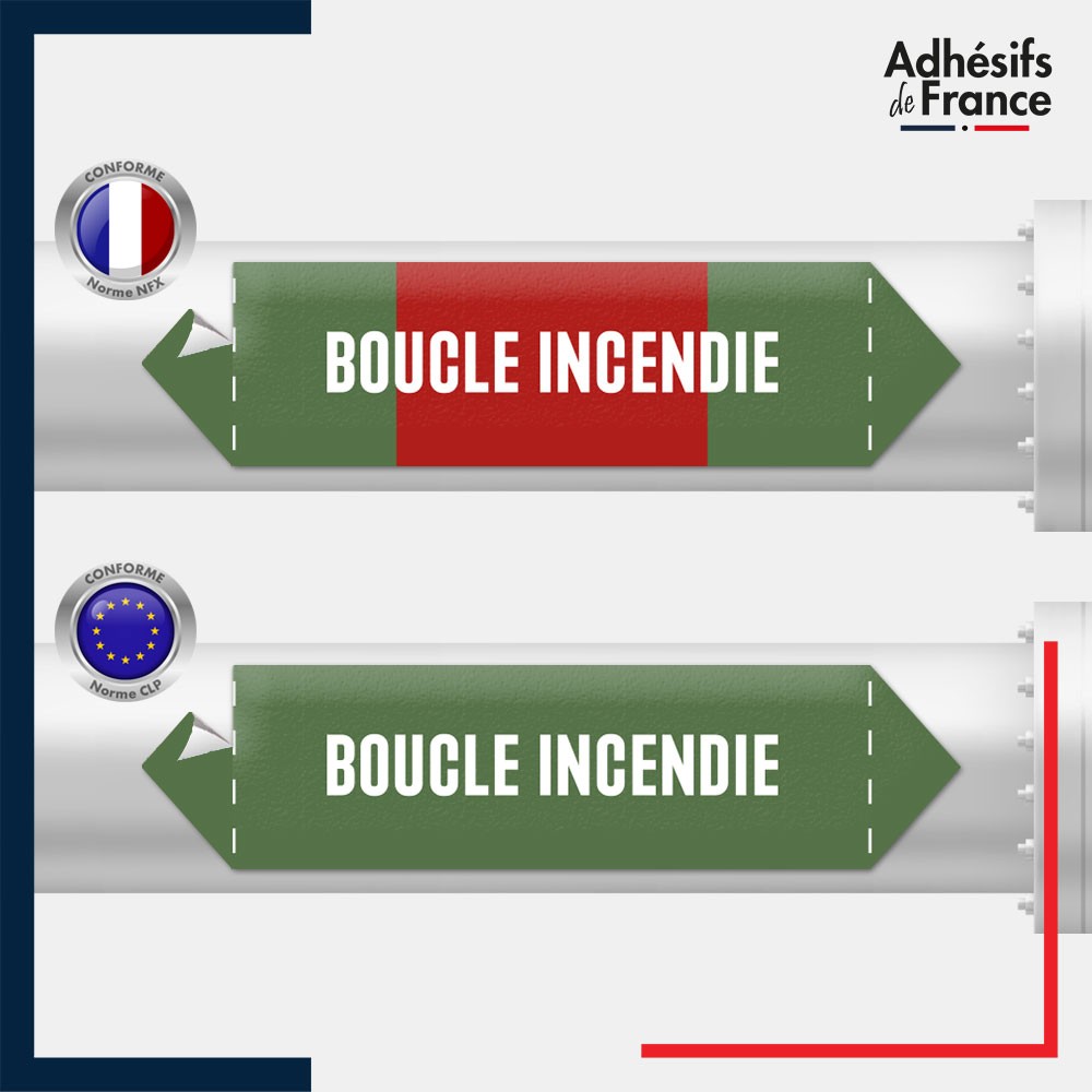 Marqueur adhésif de Tuyauterie - Eau - Boucle incendie imprimé sur un adhésif vinyle laminé (plastifié) avec une colle renforcée s'adaptant et résistant à tous types de tuyauteries et d'environnements.