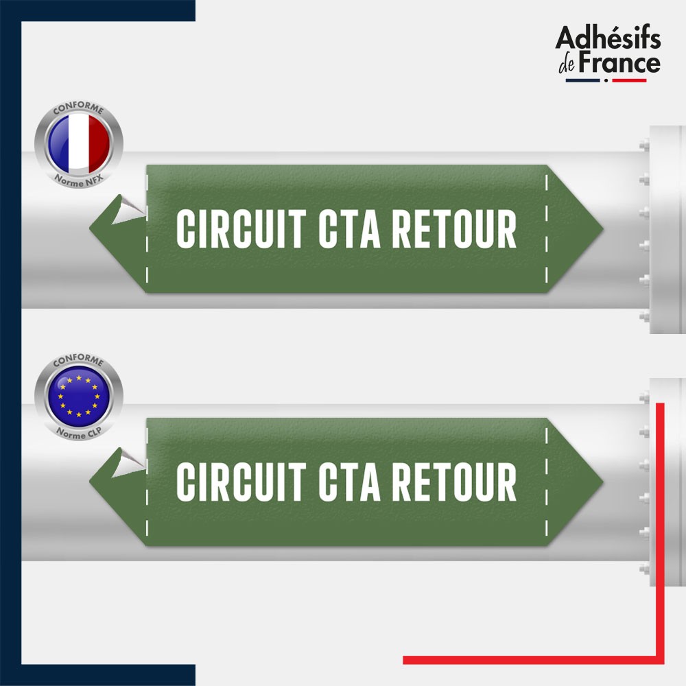 Marqueur adhésif de Tuyauterie - Eau - Circuit cta retour imprimé sur un adhésif vinyle laminé (plastifié) avec une colle renforcée s'adaptant et résistant à tous types de tuyauteries et d'environnements.