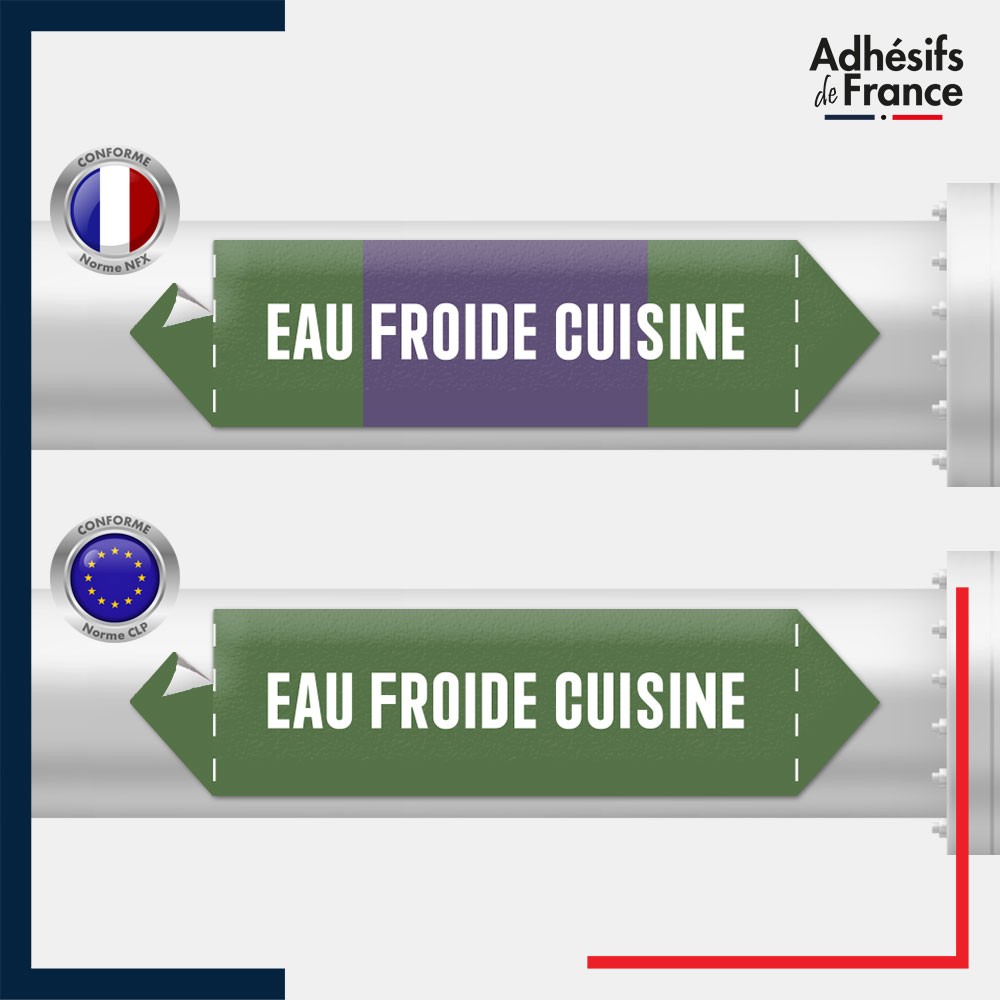Marqueur adhésif de Tuyauterie - Eau froide cuisine imprimé sur un adhésif vinyle laminé (plastifié) avec une colle renforcée s'adaptant et résistant à tous types de tuyauteries et d'environnements.