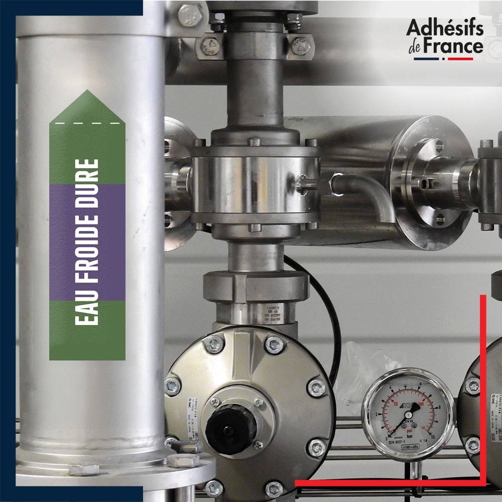 Marqueur adhésif de Tuyauterie - Eau froide dure imprimé sur un adhésif vinyle laminé (plastifié) avec une colle renforcée s'adaptant et résistant à tous types de tuyauteries et d'environnements.