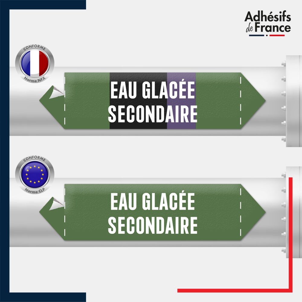 Marqueur adhésif de Tuyauterie - Eau glacée secondaire imprimé sur un adhésif vinyle laminé (plastifié) avec une colle renforcée s'adaptant et résistant à tous types de tuyauteries et d'environnements.