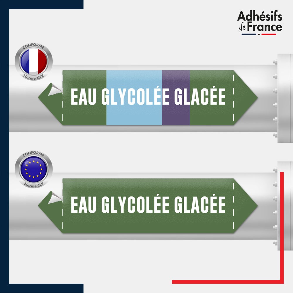 Marqueur adhésif de Tuyauterie - Eau glycolée glacée imprimé sur un adhésif vinyle laminé (plastifié) avec une colle renforcée s'adaptant et résistant à tous types de tuyauteries et d'environnements.