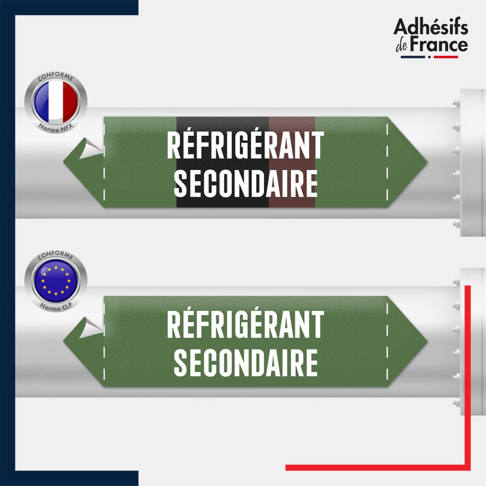 Marqueur adhésif de Tuyauterie - Eau - Réfrigérant secondaire imprimé sur un adhésif vinyle laminé (plastifié) avec une colle renforcée s'adaptant et résistant à tous types de tuyauteries et d'environnements.