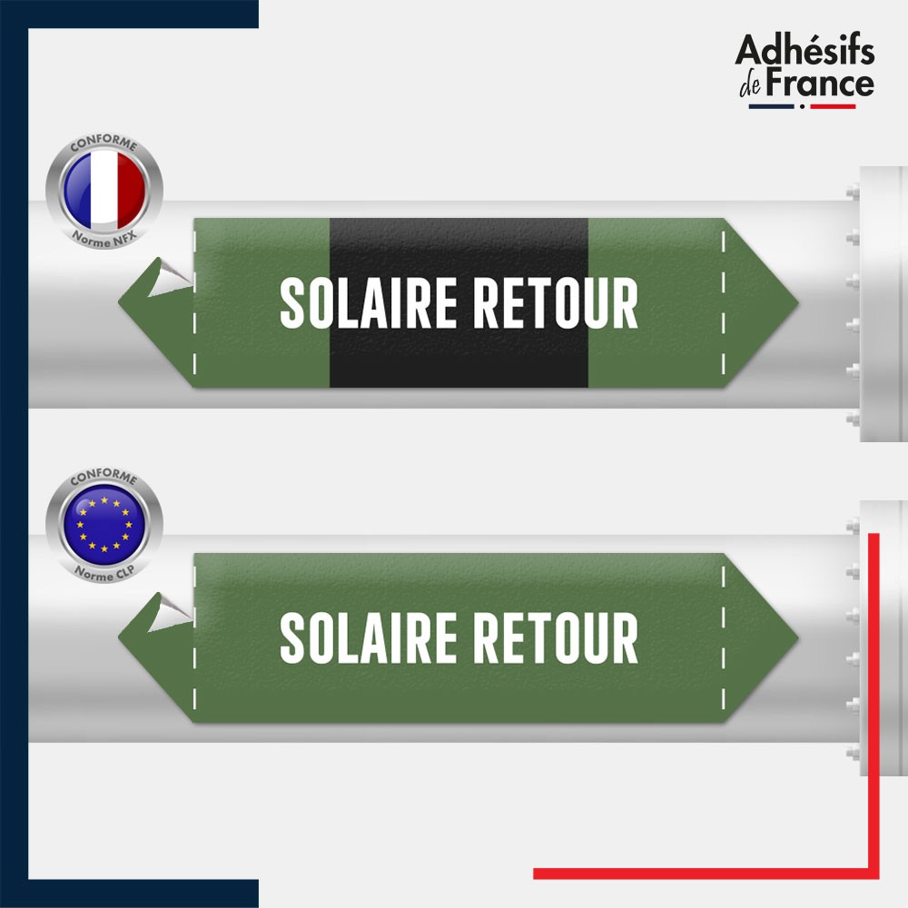 Marqueur adhésif de Tuyauterie - Eau - solaire retour imprimé sur un adhésif vinyle laminé (plastifié) avec une colle renforcée s'adaptant et résistant à tous types de tuyauteries et d'environnements.
