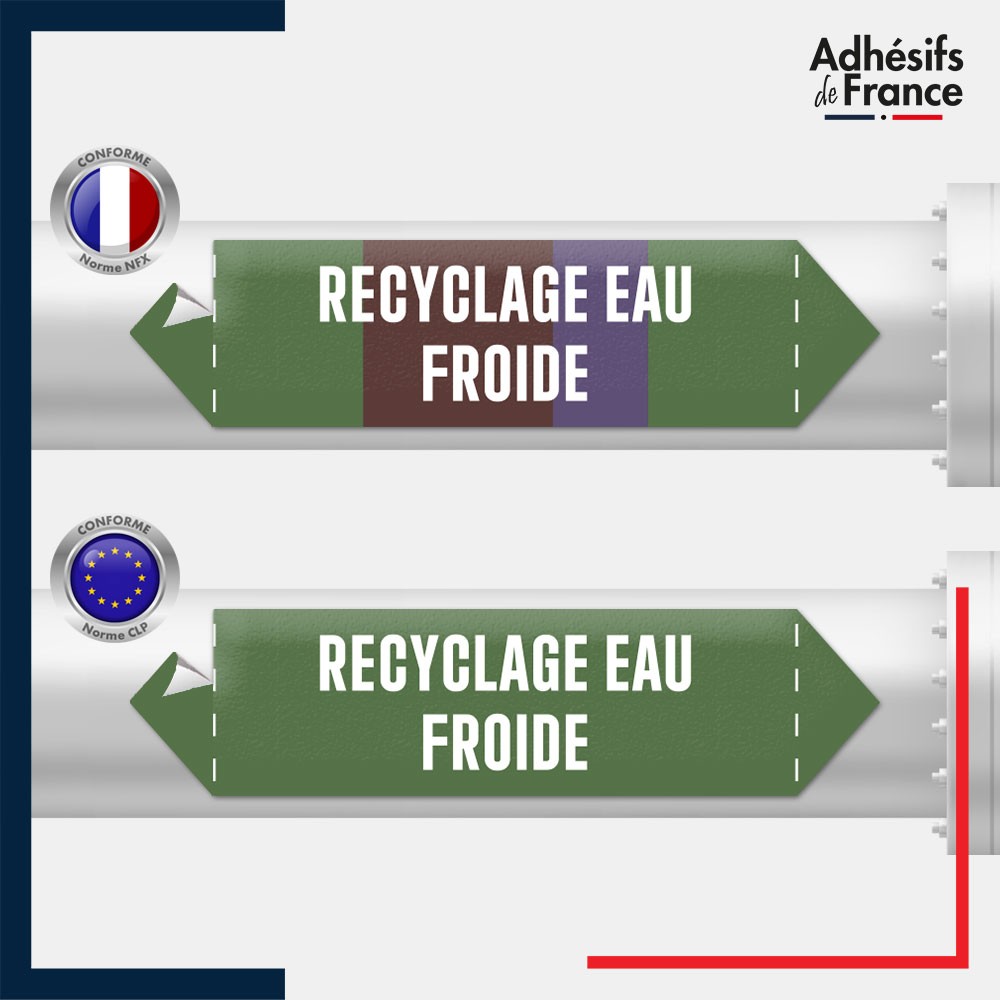 Marqueur adhésif de Tuyauterie - Recyclage eau froide imprimé sur un adhésif vinyle laminé (plastifié) avec une colle renforcée s'adaptant et résistant à tous types de tuyauteries et d'environnements.